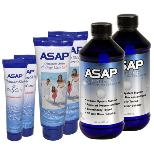 Safe for everyday use, ASAP Silver Solution helps boost your immune system and protect you and your loved ones from harmful pathogens and microbes. Silver Sol's patented technology processes silver molecules into nano particles that are easily dispersed and kept suspended in purified water - this is the key to their gentle effectiveness.Here is how we differ from other silver products and what makes ASAP thousands of times more effective at neutralizing harmful pathogens than the colloidal silver that has been around for more than 100 years. Nano-sized particles of silver Concentration Catalytic action Approved by the EPASize Nano particles are so small that they pass through your body's cells instead of becoming lodged in any major organs. Perfectly safe in any quantity.Concentration ASAP Silver Sol has 10 parts per million (ppm) with an efficiency rate of neutralizing microbes of over 99 percent. Colloidal silver has concentrations of 300 to 30,000 ppm with efficiency rate between 15 and 65 percent.Catalytic Action ASAP Silver Sol's particles seek out the pathogens. Once found, they attach to the pathogens' cell walls, which eventually leaves holes in the membranes, subsequently killing the pathogens. Most other silver products work by chemical action, meaning that they must have direct contact with microbes to have any positive effect.Take ASAP Silver Sol every day to maintain a healthy immune system and avoid unnecessary illnesses caused by the microbes that are constantly attacking your body.ASAP Silver Sol is great for: Wound healing Burn treatment Bites Rashes Flu Colds Ear infections Pink eye Water purificationIncluded in the Starter Kit is: 2 - ASAP Silver Sol Liquid - 8 oz 2 - ASAP Silver Sol Gel - 4 oz 2 - ASAP Silver Sol Gel - 1.5 ox