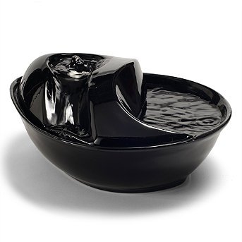 Modern raindrop shape. Choose stainless steel or black ceramic. Ultra-quiet pump circulates and oxygenates wate. Dishwasher safe. 7' cord with easy-click disconnect for removal before cleaning the unit. Fresh, clean water from our Raindrop Pet Fountains is readily available to your pets whenever they are thirsty. Water is constantly circulated through a replaceable charcoal filter that removes impurities and odors, while the moving water naturally enticing both cats and dogs to drink. . . . . . 120V .